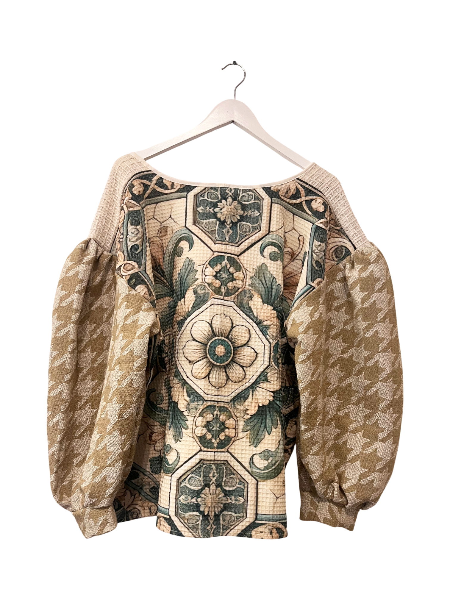 Upcycled Cat Print Puff Sleeve Top Beige And Cream